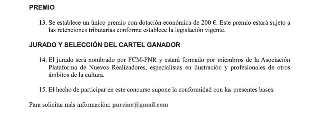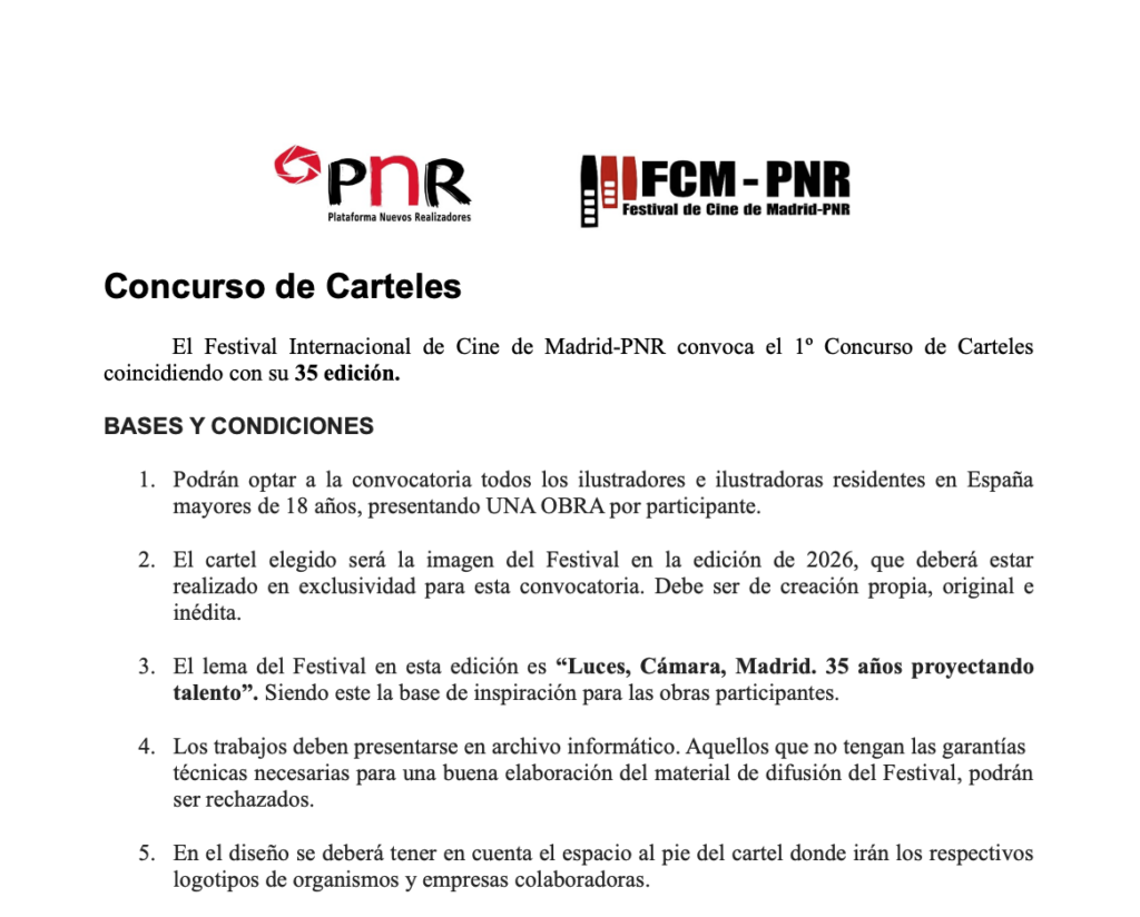 El Festival Internacional de Cine de Madrid–PNR ha convocado un concurso de carteles para su 35ª edición. La propuesta seleccionada será la imagen oficial del festival en 2026 y se aplicará a todos sus soportes de comunicación. La dotación económica prevista para ese trabajo es de 200 euros, sujetos además a las retenciones fiscales correspondientes.