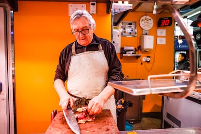 Higinio Gómez, despiezando una codorniz en la pollería Hermanos Gómez Ortiz, en el Mercado de Vallehermoso (Madrid).Álvaro García