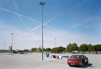 - “La fotografía más antigua del libro sirve también de portada. Cuando la hice, me di cuenta de que de aquí podía surgir algo más grande. Me muevo de forma intuitiva: de golpe encuentras una foto que es el germen del proyecto. La imagen está cargada de misterio. Sucede algo sencillo y cotidiano: alguien ha lavado la ropa y la tiende al sol. Lo extraño es dónde ocurre. Una sensación de desconcierto que aumenta cuando uno se fija en el coche, relativamente nuevo, brillante y cuidado. ¿Qué le habrá pasado a esta persona para que tienda la colada aquí? ¿Dónde habrá lavado esa ropa? Me gusta que las imágenes queden abiertas a la interpretación; su capacidad de evocación. En fotografía, el resultado final depende mucho de quién mira y desde dónde lo hace”.