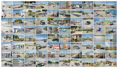 - “El libro se organiza como un plano secuencia, como si fuésemos de la mano dando la vuelta a Carrefour. Cada foto te lleva a la siguiente, y en cada una encuentras un elemento que conecta con la otra. Así, la sobrecubierta se despliega como un póster donde se muestran estas conexiones a través de líneas y redondeles que señalan el mismo objeto desde diferentes puntos de vista. Esto tiene mucho que ver con la fotografía, que no deja de ser un punto de vista conceptual y también físico. Situado siempre encima de la furgoneta, a una altura de tres metros y medio, el horizonte se levanta y los objetos se recortan sobre el suelo, en un mismo plano abierto. El asfalto es un elemento fundamental en este proyecto, así como lo es en la construcción del paisaje por parte de los humanos. Se percibe un intento de esterilizar un territorio, cubrirlo de asfalto u hormigón para crear un superficie perfecta por donde se deslicen las ruedas de los distintos vehículos; de forma controlada han quedado marcados varios agujeros para que crezca un árbol. Y sobre esa superficie muerta pasamos nuestras vidas, aprendemos a montar en bici, a conducir y llevamos a nuestro hijos a probar el dron que le regalamos en Reyes”.