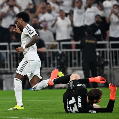 Jeddah (Saudi Arabia), 08/01/2026.- Rodrygo of Real Madrid (L) scores the 0-2 goal against goalkeeper Jan Oblak of Atletico Madrid during the Spanish Super Cup semi final between Atletico Madrid and Real Madrid in Jeddah, Saudi Arabia, 08 January 2026. (Arabia Saudita) EFE/EPA/STR