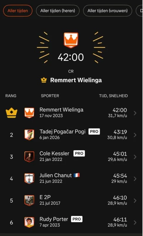 “Hice 2 minutos a 9,57 vatios, pregunten a Pogacar si puede lograrlo”. El interesante desafío no es broma y corresponde al ex ciclista profesional Remmert Wielinga, quien hace una década y media corrió en el Pro Tour para Saunier Duval, Quick Step y Rabobank. El ex pedalista tiene ahora 47 años pero se mantiene muy en forma y aún posee el récord en un segmento de Strava que salió ayer a la luz porque Tadej Pogacar lo hizo y quedó segundo.