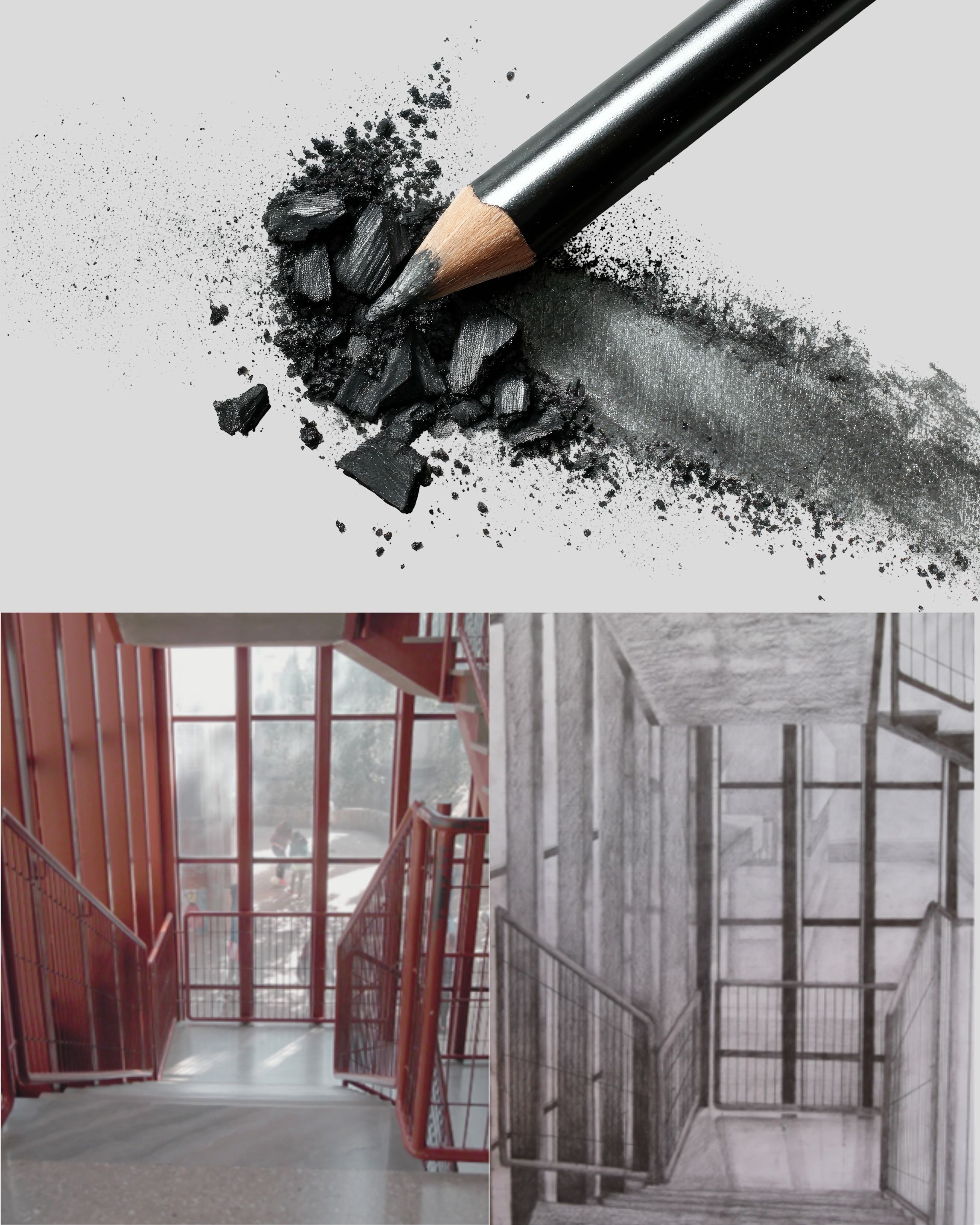 Los espacios exteriores del centro son uno de los enclaves habituales de trabajo. La ruptura con la rutina del aula es también un aspecto interesante. Los alumnos se ubicaban en distintos emplazamientos, desde la cafetería hasta otras dependencias. Las escaleras, con sus complejos problemas espaciales, eran uno de los lugares más recurrentes.