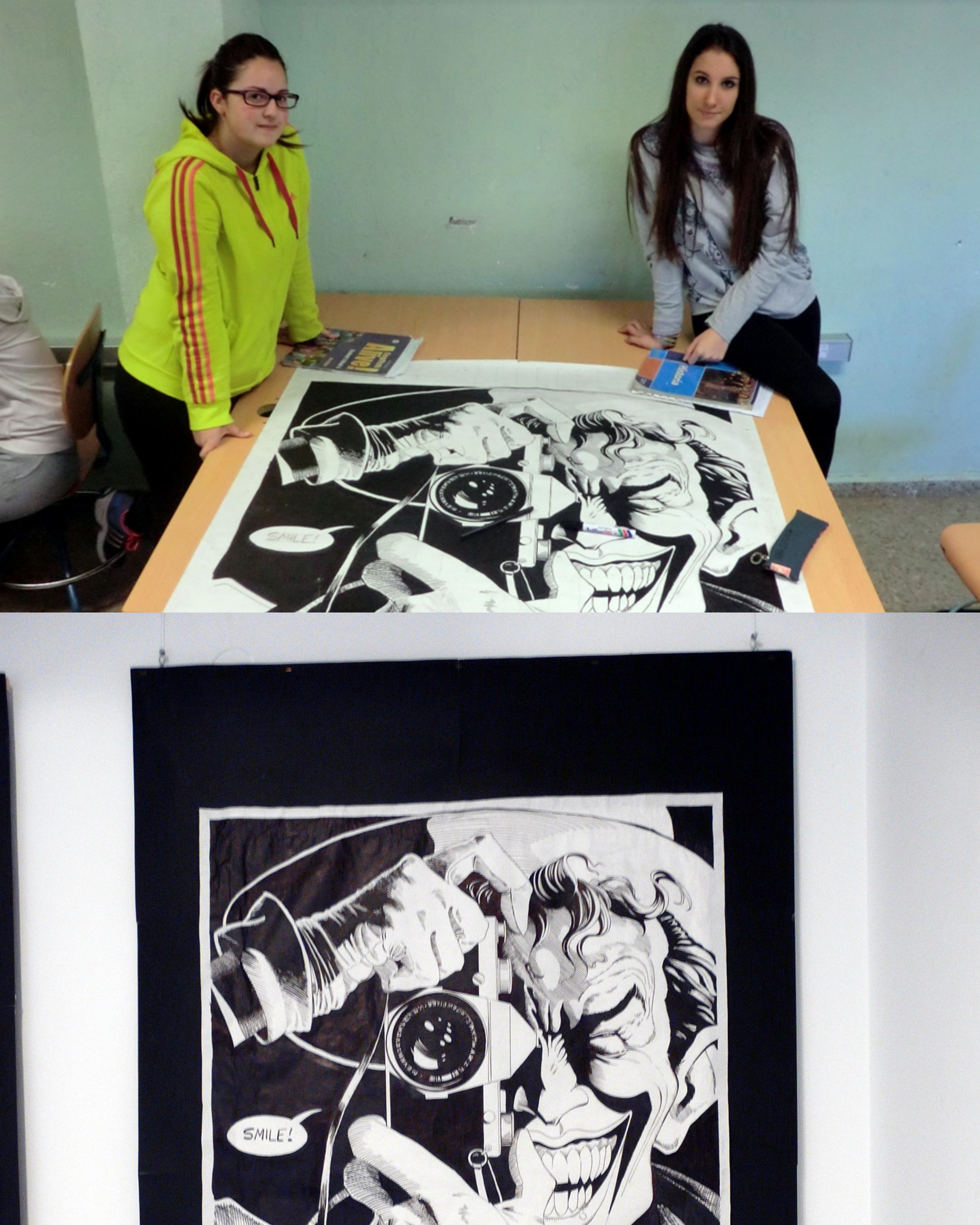 Dos alumnas presentan su interpretación del Joker, resultado del proyecto de dibujo basado en observación y análisis visual.