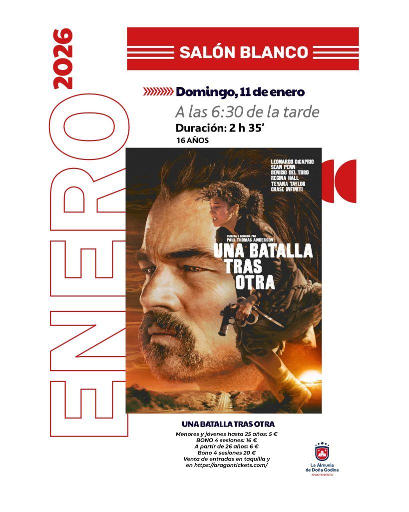El Ayuntamiento de La Almunia invita a la proyección de la película “Una batalla tras otra” en el Cine-Teatro Salón Blanco el próximo Domingo, día 11 de Enero, a las 18:30 h. RECOMENDAMOS que las entradas sean adquiridas ANTICIPADAMENTE (sin comisión) hasta una hora antes del inicio de la proyección en www.aragontickets.com