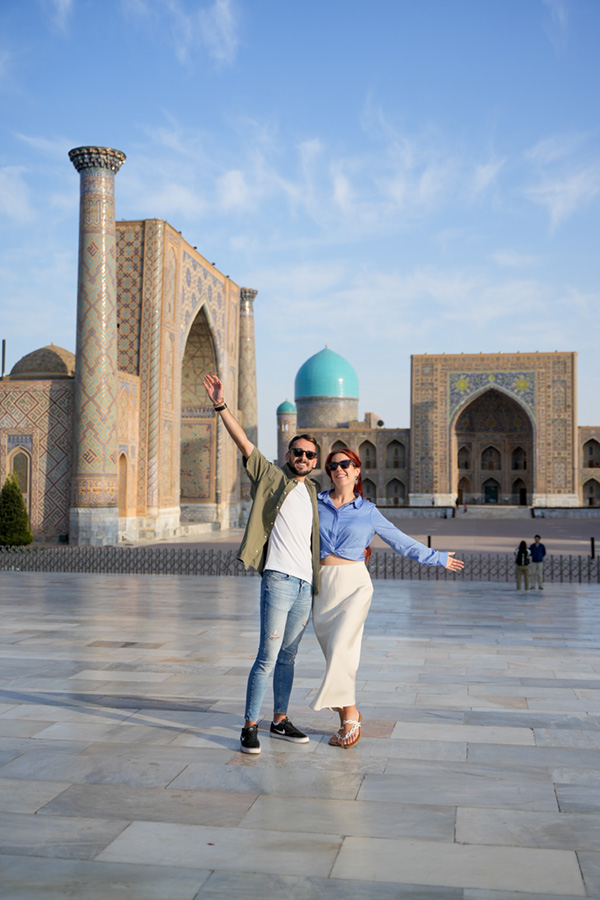 La pareja viajera, en la plaza Registán de Samarcanda (Uzbekistán).