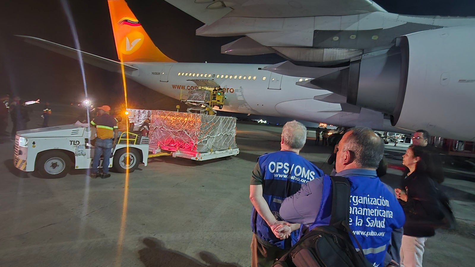 Los insumos llegaron en un vuelo especial de la aerolínea Conviasa desde Sao Paulo, y fueron recibidos en la propia pista por la vicepresidenta sectorial Gabriela Jiménez, el viceministro de Hospitales Jesús Osteicochea, la embajadora de Brasil en Venezuela Elivania Maria de Oliveira y el representante de la OPS en Venezuela, Armando De Negri.