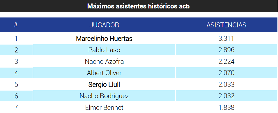 También cifra récord para otro veterano, Sergi Llull, en su caso como histórico en la lista de máximos asistentes de la historia. Ha ascendido a la quinta posición y tiene muy cerca al cuarto, Albert Oliver. Quien suma y sigue como primero de esta estadísticas es Marcelinho Huertas, que va a dejar cuando se retire la típica cifra que durará décadas y décadas. El base del Laguna Tenerife es asimismo séptimo en valoración histórica de momento, aunque puede superar a Arlauckas y Joan Creus en dos o tres jornadas.