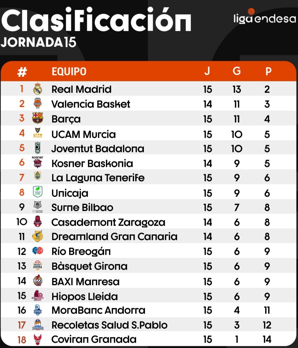 El fin de semana nos dejó, dentro de la jornada 15, las victorias de los equipos grandes con excepción del Valencia Basket, en su caso jugando, eso sí, contra el quinto presupuesto de la liga acb como es el Unicaja. Derrotas de varios equipos de abajo como el Granada, el Burgos, el Girona y el Andorra, aunque vencieron el Zaragoza, el Lleida y el Manresa y eso complica al conjunto burgalés y al andorrano.