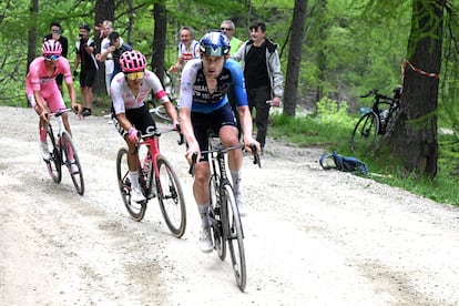 Derek Gee, el pasado 31 de mayo con el ‘maillot’ del equipo Israel durante el Giro de Italia, seguido por Richard Carapaz e Isaac del Toro.Dario Belingheri (Getty Images)