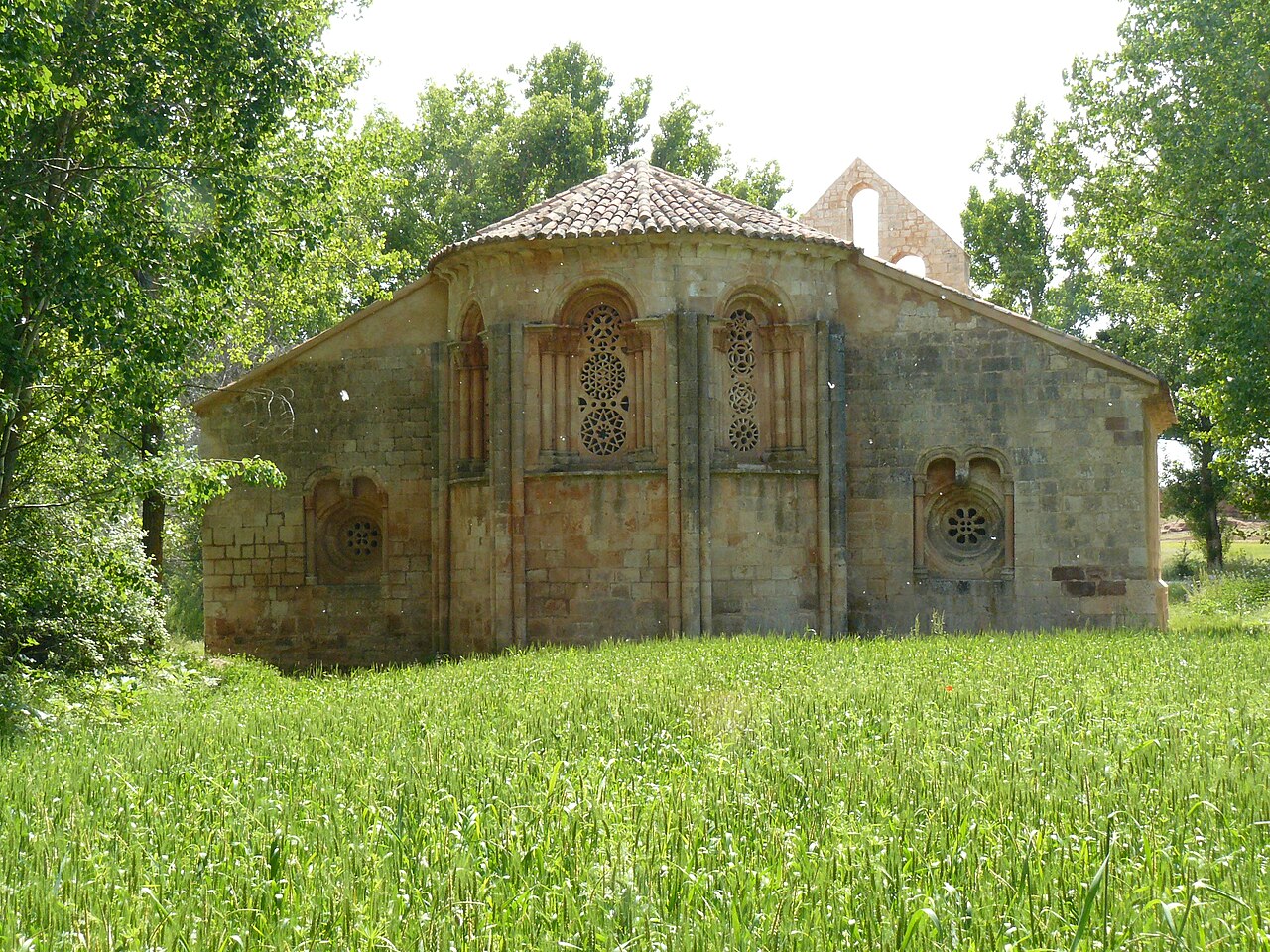 Unos kilómetros más al norte, en la falda de la Sierra de Pela, Santa Coloma de Albendiego introduce una singularidad que Peridis ha subrayado en varias ocasiones: sus celosías de piedra, únicas en el románico peninsular, que tamizan la luz con una geometría casi oriental. El templo está documentado como uno de los ejemplos más singulares del románico provincial en los fondos de Románico Digital.