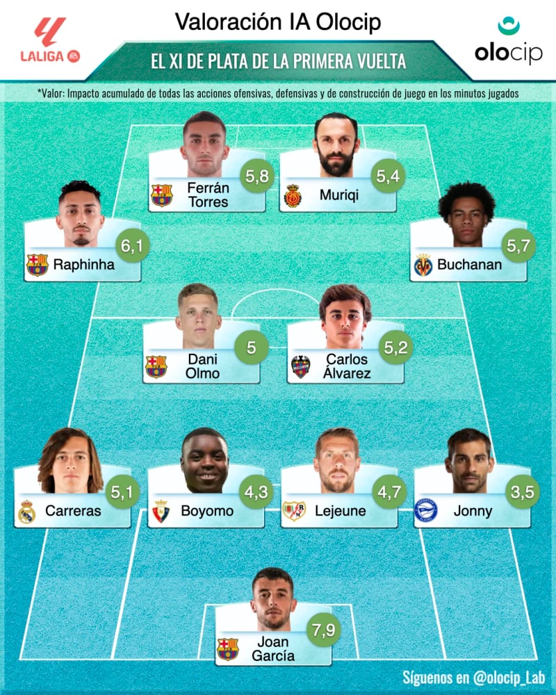 En el segundo mejor equipo que se puede formar con las estrellas de LaLiga, según la IA de Olocip, la portería es para Joan García (Barcelona); en defensa Jonny Otto (Celta), Florian Lejeune (Rayo Vallecano), Enzo Boyomo (Osasuna) y Álvaro Carreras (Real Madrid); en la medular destacan Tajon Buchanan (Villarreal), Carlos Álvarez (Levante), Dani Olmo y Raphinha Dias (Barça); y arriba formarían dupla el también culé Ferran Torrés y Vedat Muriqi (Mallorca).