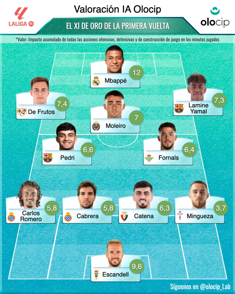 La alineación con los jugadores que más valor han generado para sus equipos de LaLiga en la primera vuelta está formado por Aarón Escandell (Real Oviedo) en la portería; con Alejandro Catena (Osasuna) y Leando Cabrera (RCD Espanyol) como centrales escoltados en los laterales por Óscar Mingueza (Celta) y Carlos Romero (RCD Espanyol). En el centro del campo están Pedri (Barcelona) y Pablo Fornals (Real Betis), con Alberto Moleiro (Villarreal) en la mediapunta, Lamine Yamal (Barcelona) y Jorge de Frutos (Rayo Vallecano) en los extremos; y Kylian Mbappé (Real Madrid) en la punta de ataque.