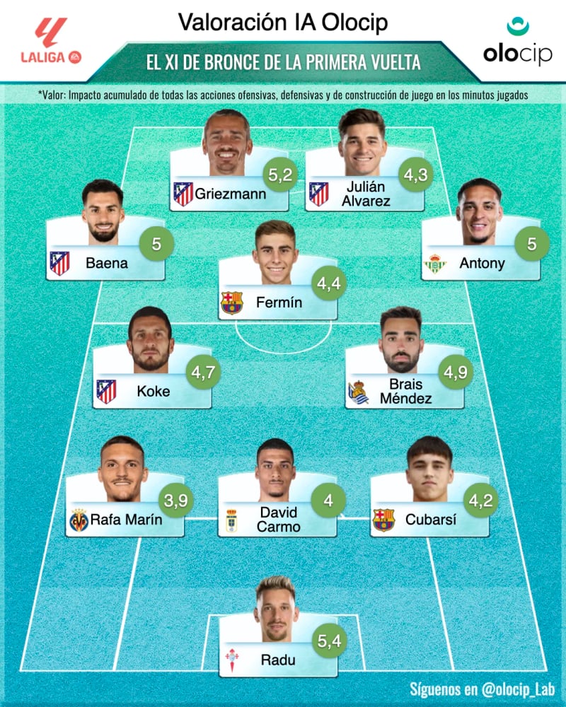 Por último, para completar los 33 jugadores más destacados en la primera vuelta, la alineación de bronce de la IA en las primera 19 jornadas disputadas en LaLiga 25/26 estaría formada por Ionut Radu (Celta); Pau Cubarsí (Barcelona), David Carmo (Oviedo) y Rafa Marín (Villarreal) en una línea de tres centrales; con Brais Méndez (Real Sociedad), Koke Resurrección (Atlético) y Fermín López (Barcelona) en una medular con Antony dos Santos (Real Betis) y Álex Baena (Atlético) en los extremos y con los colchoneros Julián Álvarez y Antoine Griezmann como referencias más adelantadas.