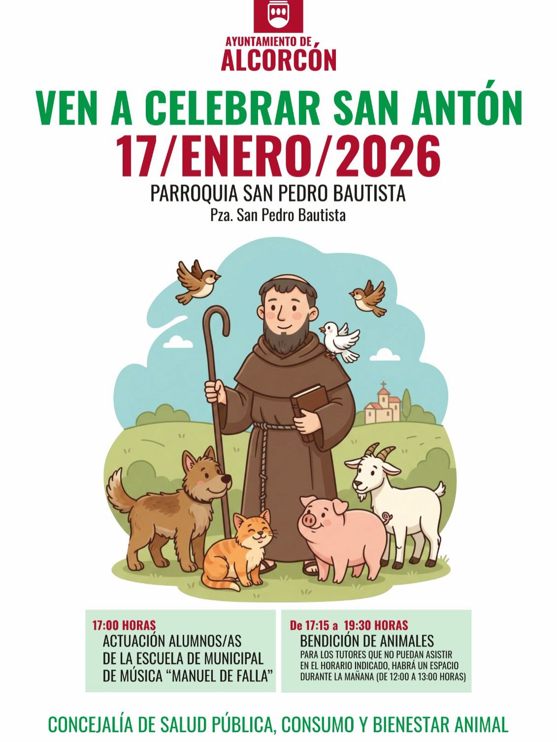 • El acto, impulsado por la parroquia San Pedro Bautista, en colaboración con la Concejalía de Bienestar Animal, tendrá lugar el viernes 17 de enero en la Plaza de San Pedro Bautista y contará con la participación de la Escuela Municipal de Música Manuel de Falla.