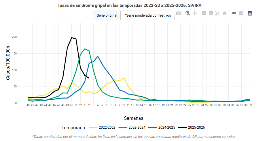 La vigilancia de infecciones respiratorias agudas (IRA) en España indica que la actividad de la gripe se mantiene en niveles bajos, aunque continúa presente en la población tras los picos registrados a finales de diciembre, según los últimos datos del Sistema de Vigilancia de Infección Respiratoria Aguda (SiVIRA) correspondientes a la semana 02/2026 (5-11 de enero).
