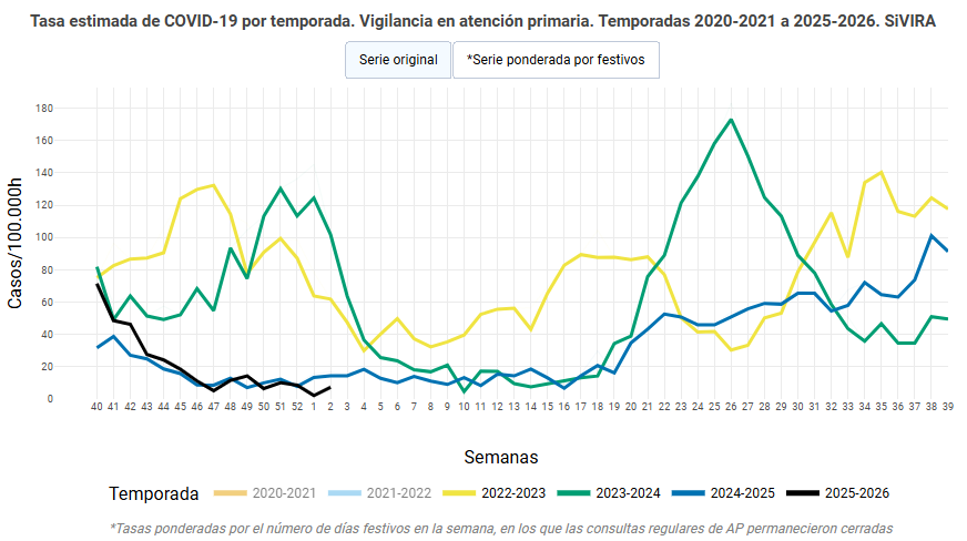 Aunque la gripe domina la vigilancia estacional, otras infecciones respiratorias continúan circulando. La incidencia estimada de COVID-19 se situó en 7,3 casos por 100.000 habitantes, con una positividad del 1,2%, mientras que en hospitalizaciones se mantuvo baja, con 0,2 casos/100.000 h. Los casos graves de COVID-19 hospitalizados presentan un 24,1% de neumonía, un 4,7% de ingreso en UCI y un 10,1% de letalidad desde el inicio de temporada.