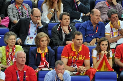 De izquierda a derecha y de arriba abajo, el príncipe Alberto II de Mónaco y el príncipe heredero Federico de Dinamarca, detrás de la princesa Irene de Grecia, la reina emérita Sofía, Felipe VI y la reina Letizia, durante la final masculina de baloncesto entre Estados Unidos y España en los Juegos Olímpicos de Londres 2012, celebrada en el North Greenwich Arena. Pascal Le Segretain (Getty Images)