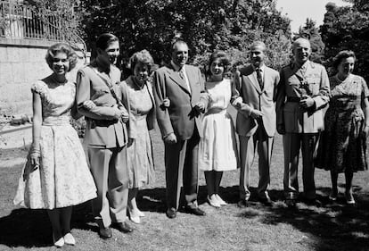 La familia real griega el día del anuncio del compromiso de Juan Carlos con Sofía, el 12 de septiembre de 1961 en Lausana. Desde la izquierda: la princesa Irene, el príncipe Constantino, la reina Federica, don Juan de Borbón, doña Sofía y Juan Calos, Pablo I de Grecia y doña María de las Mercedes de Borbón y Orleans.Daniele Darolle (Sygma/Getty Images)