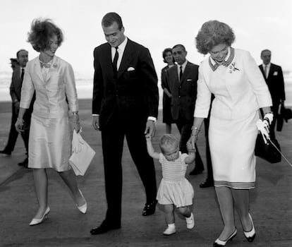 Juan Carlos de Borbón y la reina Sofía, acompañados por su hija Elena, son recibidos en el aeropuerto de Barajas por la princesa Irene de Grecia, en 1965.Gianni Ferrari (Cover/Getty Images)
