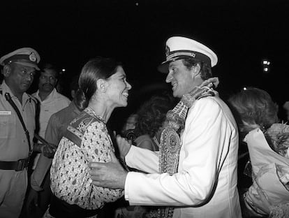 El rey Juan Carlos I saluda a su cuñada, la princesa Irene de Grecia, quien acudió al aeropuerto de Madrás (India) para recibir a los soberanos españoles, en enero de 1982.ÁNGEL MILLÁN (EFE)Testigo de la Transición