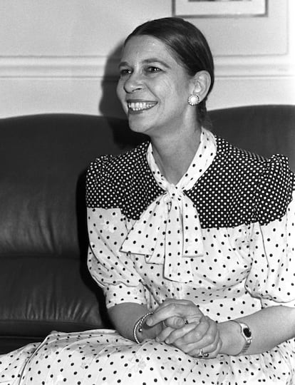 La princesa Irene de Grecia, en mayo de 1986, tras recibir el cheque con los beneficios del concierto ofrecido del 16 de abril de ese año, en el Teatro Real, por la Joven Orquesta de la Comunidad Europea, destinado a la fundación que preside Mundo en Armonía.PEPE VELASCO (EFE)