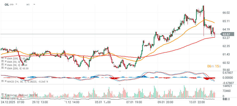 La caída del petróleo está encontrando soporte en la EMA de 200 períodos en el gráfico horario, alrededor de US$63,5 por barril. El volumen vendedor ha dominado desde las horas nocturnas. Aun así, vale destacar que el escenario de un ataque no está completamente descartado, aunque hasta ayer el mercado lo consideraba casi inevitable.