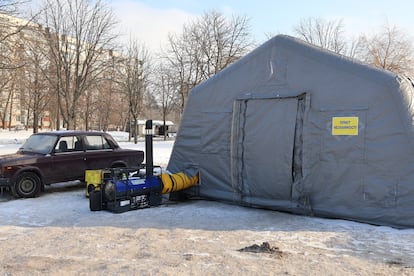 El Servicio de Emergencias de Ucrania está desplegando miles de tiendas de campaña de primeros auxilios energéticos por todo el país. Una de estas se ubica ante el estadio municipal de Brovarí. Dentro pasa las horas la familia Kisilichin. La esposa de Mijailo, que no quiere facilitar su nombre, trabaja con su ordenador, abrigada de pies a cabeza. Sobre la mesa tienen un calentador de agua, té y galletas. Los Kisilichin son de Bajmut. Ella era funcionaria municipal y huyó junto a sus dos hijos de esta ciudad de Donbás en 2022, cuando estalló la invasión rusa. El marido esperó hasta la primavera de 2023, cuando la vida allí ya era insostenible y Rusia estaba cerca de conquistar las ruinas de la ciudad. En Bajmut lo perdieron todo menos la vida.
