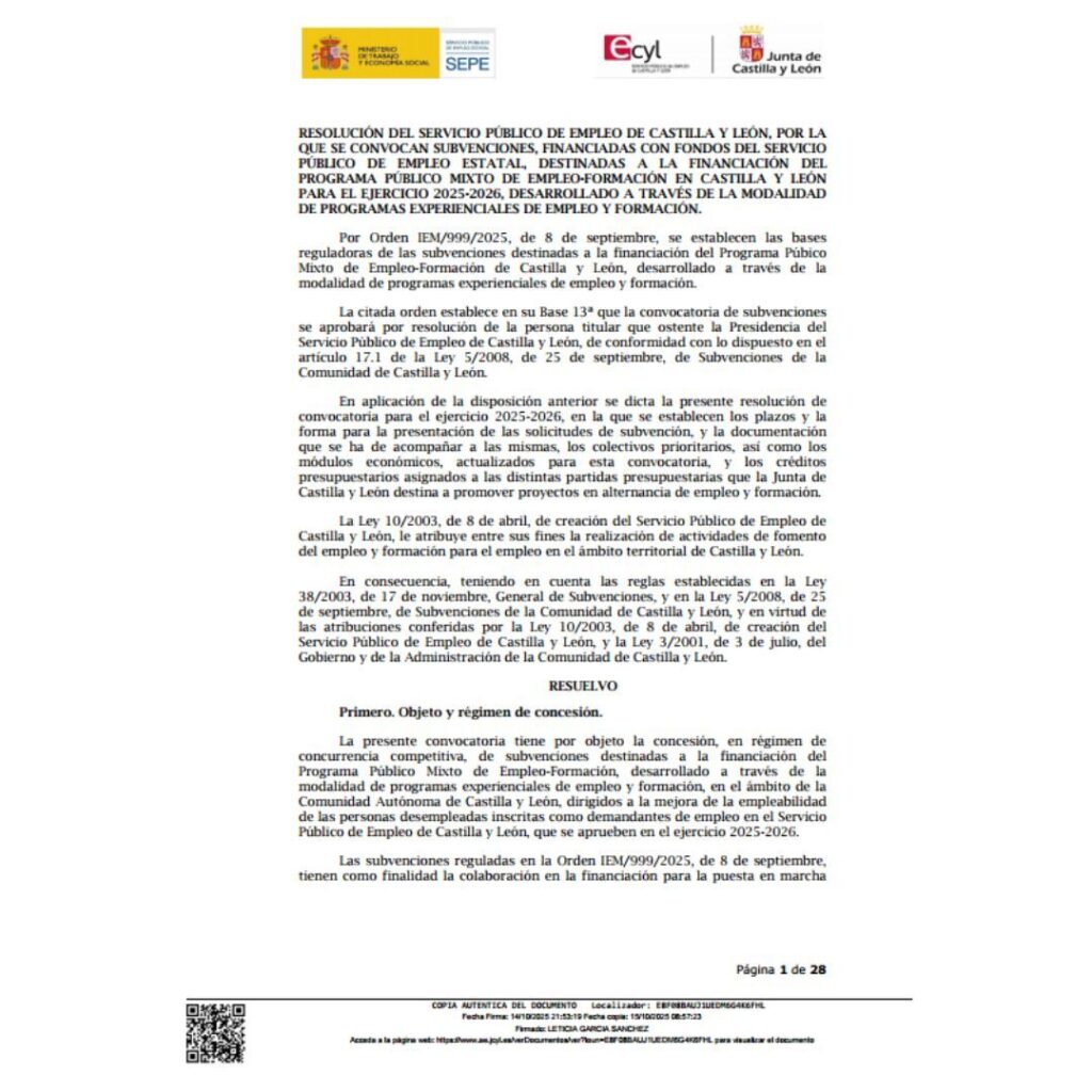 El Ayuntamiento de Íscar ha sido beneficiario de una subvención concedida por el Servicio Público de Empleo de Castilla y León, financiada con fondos del Servicio Público de Empleo Estatal, para el desarrollo de un Programa Público Mixto de Empleo-Formación.