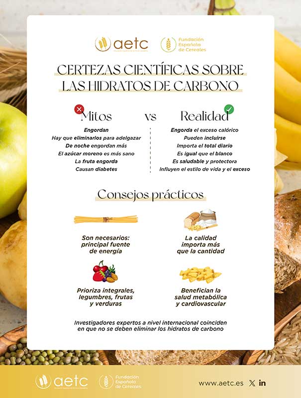 Frente a la creciente demonización de los hidratos de carbono en redes sociales y algunos discursos mediáticos, la evidencia científica es clara: no son el enemigo, sino un componente imprescindible de una alimentación saludable. Así lo recoge el argumentario elaborado por la Asociación Española de Técnicos Cerealistas (AETC), con el apoyo del grupo de investigación InnograinLab de la Universidad de Valladolid, cuyo objetivo es aclarar, con base científica, algunos de los mitos más extendidos en torno a este grupo de nutrientes.