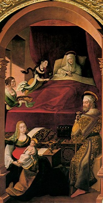 Otra de las obras en las que podemos encontrar San Joaquín y Santa Ana es la Natividad de la Virgen de Alejo Fernández (1509 – 1512). La pintura se estructura en dos planos sucesivos en los que se sitúan los personajes que han asistido a Santa Ana en su parto. En el superior aparece en un ancho lecho con ampuloso dosel la madre de la Virgen recostada sobre varios almohadones. A su izquierda se acercan al borde de la cama dos doncellas de gráciles perfiles y vaporosas vestimentas que se agitan al precipitarse hacia el tálamo. En el otro grupo, en el plano inferior de la tabla, una doncella acaba de lavar y preparar a la Virgen, envolviendo en un lienzo a la recién nacida. San Joaquín observa sentado en un banco a su Hija a la derecha de la composición. Entre estos dos grupos se puede ver una hermosa alfombra de tipología oriental sobre la que aparece un cofre metálico y un cojín de similar tejido, que enlaza bellamente estas dos zonas.