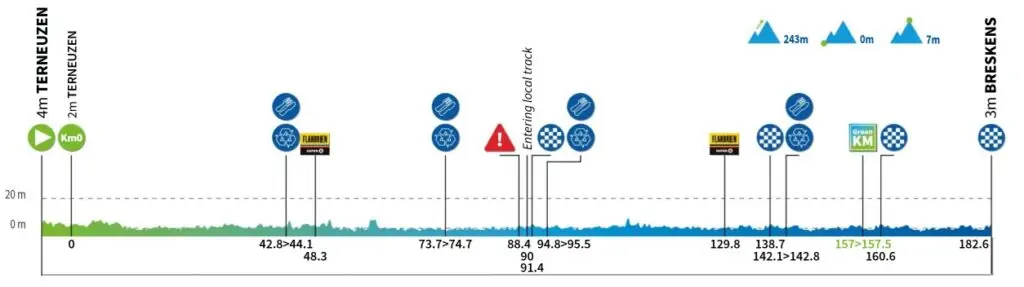 La primera etapa es una etapa llana de sprint a través de la campiña abierta de Zelanda y Holanda. Los ciclistas salen de Terneuzen y pasan por diques, molinos de viento y vastas carreteras de pólderes hacia la meta en Breskens. Hay muchas posibilidades de que haya viento, así que quién sabe, quizá ya tengamos algo de acción en la etapa inaugural. El viento y los abanicos pueden crear diferencias de tiempo en los resultados y, quién sabe, quizá ya desempeñen un papel importante en la clasificación final.