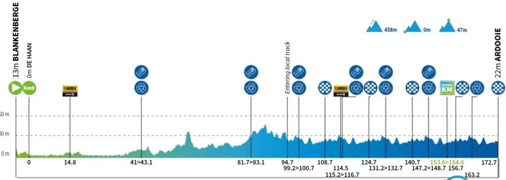 Desde la ciudad costera belga de Blankenberge, el pelotón se dirige hacia el este, a Ardooie, que suele ser el escenario de un clásico sprint en grupo. El año pasado, la etapa de Blankenberge a Ardooie también formó parte del Renewi Tour, cuando Jonathan Milan se embolsó su segunda victoria de etapa. La etapa de la próxima edición vuelve a ser predominantemente llana.