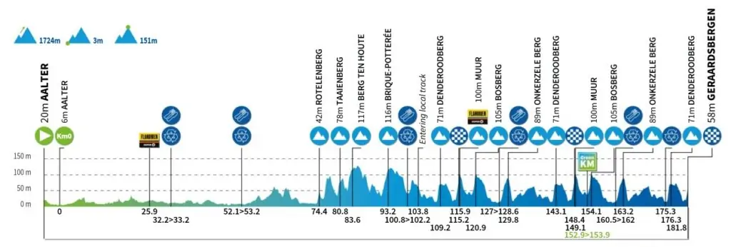 El viernes, los favoritos para la victoria final se enfrentan a su primera prueba con la tercera etapa. Desde Aalter, meta de la cuarta etapa del año pasado, el pelotón se dirige hacia las Ardenas flamencas, llegando a Geraardsbergen. Con numerosas colinas, adoquines y pasos por el emblemático Muro de Geraardsbergen, aquí se marcarán las diferencias. ¿La línea de meta? Al igual que el año pasado, en el Vesten van Geraardsbergen, donde el campeón belga Arnaud De Lie fue el más fuerte.