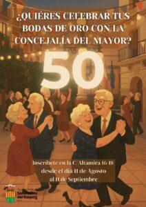 La concejalía del Mayor del Ayuntamiento de San Vicente del Raspeig ha abierto el plazo de inscripción en el programa ‘Bodas de oro’ dirigido a aquellos matrimonios de San Vicente del Raspeig que llevan cinco décadas juntos que quieran participar en la celebración de un acto conmemorativo el próximo 3 de octubre. Todos los interesados podrán apuntarse desde hoy hasta el 11 de septiembre en las oficinas municipales ubicadas en la calle Altamira números 16 y 18.