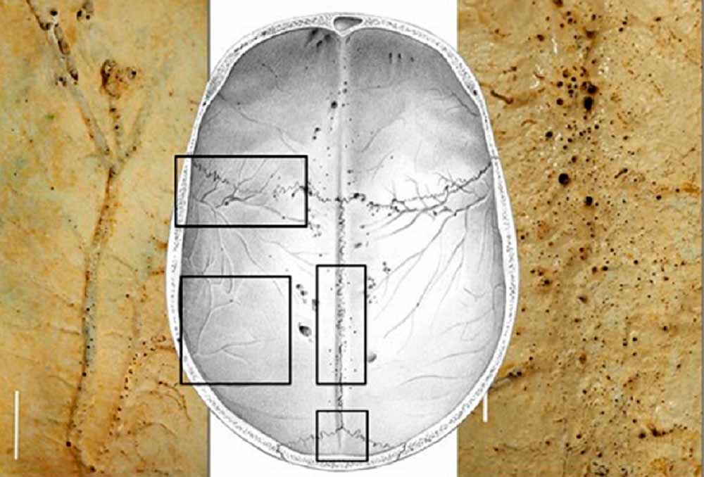 Patrón general de distribución de los microcanales en la bóveda del cráneo de un adulto y ampliación de estas regiones en los laterales / Emiliano Bruner.