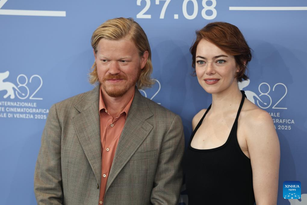 VENECIA, 28 agosto, 2025 (Xinhua) — Jesse Plemons (i), y Emma Stone, de la película «Bugonia», posan para una sesión fotográfica durante el 82° Festival de Cine de Venecia, en Venecia, Italia, el 28 de agosto de 2025. (Xinhua/Li Jing)