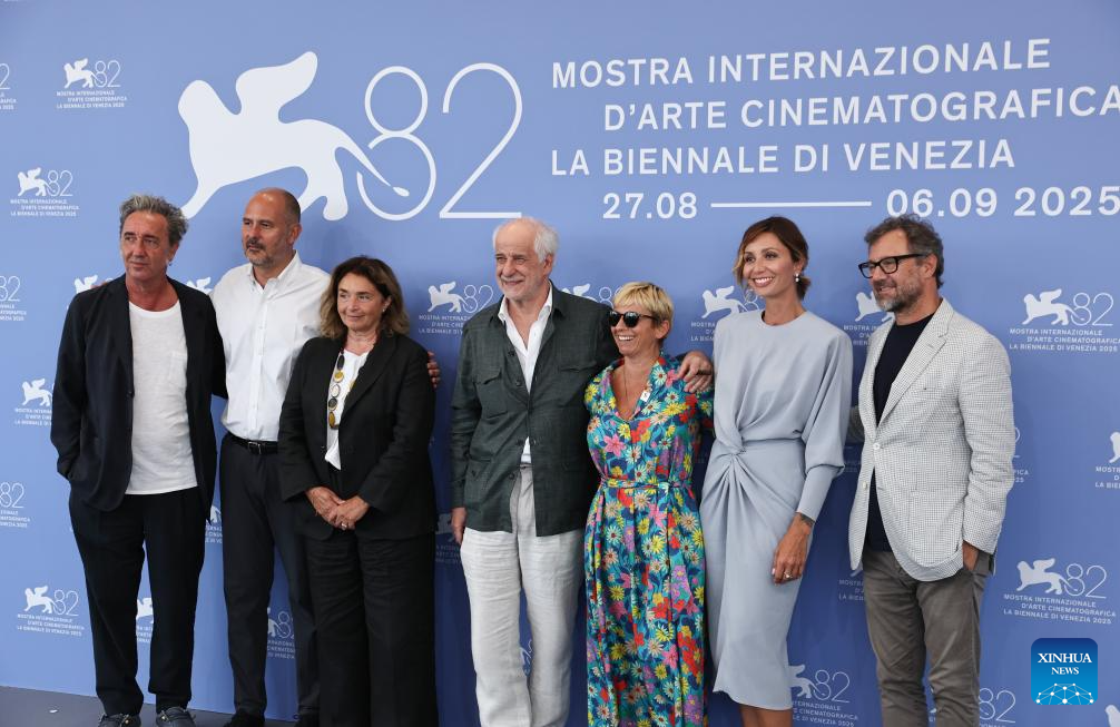 VENECIA, 28 agosto, 2025 (Xinhua) — Imagen del 27 de agosto de 2025 del equipo principal de la película «La Grazia» posando para una fotografía grupal en una sesión fotográfica del 82° Festival de Cine de Venecia, en Venecia, Italia. El 82° Festival de Cine de Venecia comenzó el miércoles en la isla de Lido, en Venecia, Italia, con 21 cintas que competirán por el premio León de Oro. (Xinhua/Li Jing)