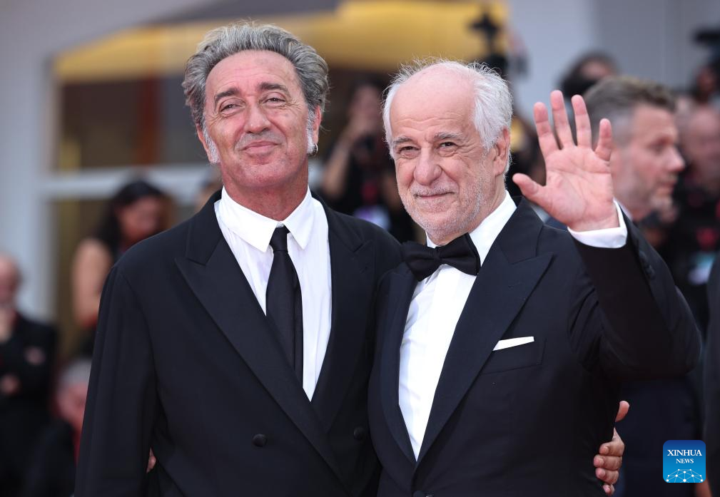 VENECIA, 28 agosto, 2025 (Xinhua) — Imagen del 27 de agosto de 2025 del director, Paolo Sorrentino (i), y el actor, Toni Servillo, de la película «La Grazia», posando para una fotografía en la alfombra roja de la ceremonia inaugural del 82° Festival de Cine de Venecia, en Venecia, Italia. El 82° Festival de Cine de Venecia comenzó el miércoles en la isla de Lido, en Venecia, Italia, con 21 cintas que competirán por el premio León de Oro. (Xinhua/Li Jing)
