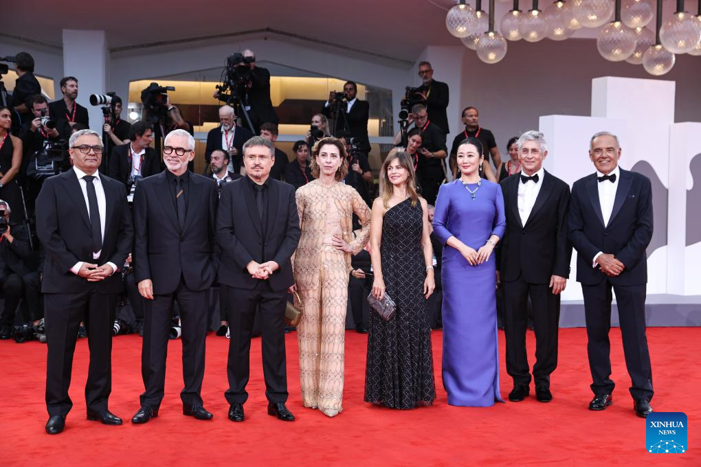 VENECIA, 28 agosto, 2025 (Xinhua) — Imagen del 27 de agosto de 2025 de los miembros del jurado del 82° Festival de Cine de Venecia posando para una fotografía grupal en la alfombra roja de la ceremonia inaugural del 82° Festival de Cine de Venecia, en Venecia, Italia. El 82° Festival de Cine de Venecia comenzó el miércoles en la isla de Lido, en Venecia, Italia, con 21 cintas que competirán por el premio León de Oro. (Xinhua/Li Jing)