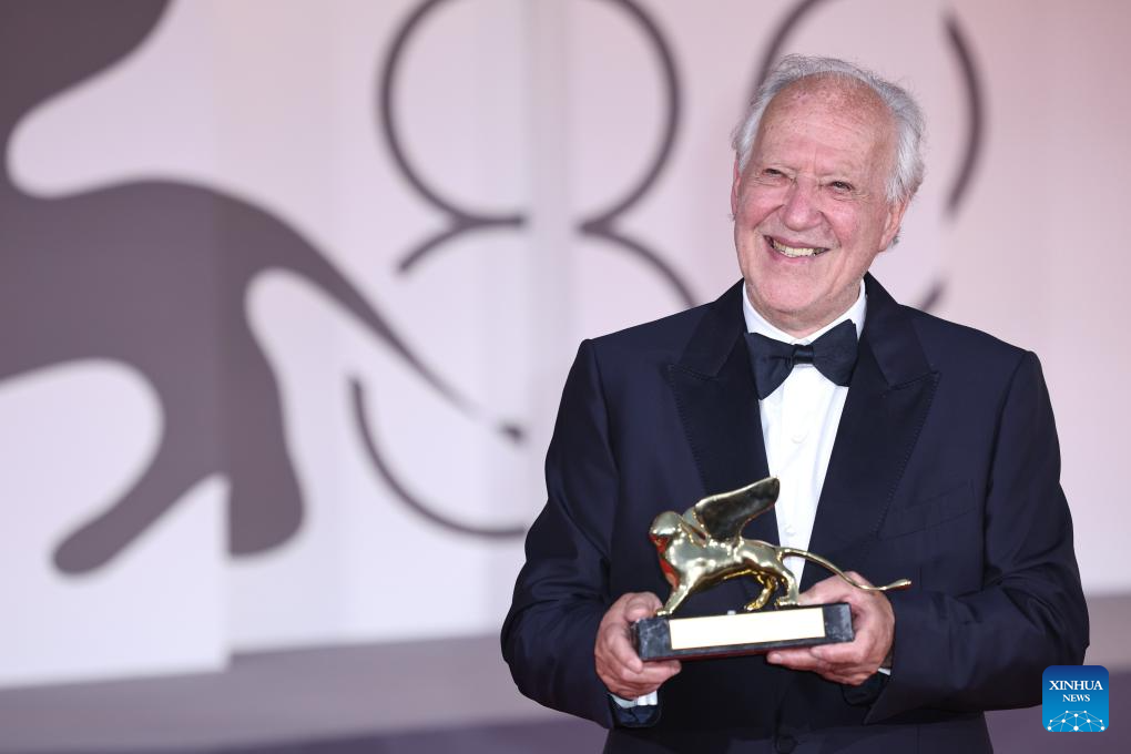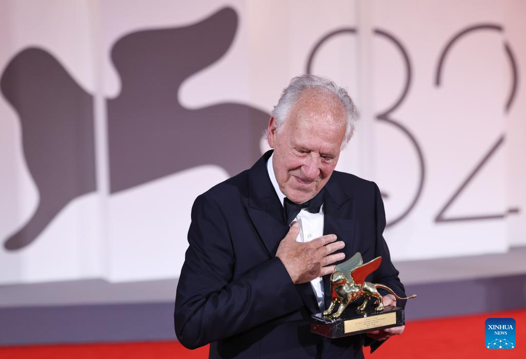 VENECIA, 28 agosto, 2025 (Xinhua) — Imagen del 27 de agosto de 2025 del director alemán, Werner Herzog, sosteniendo el trofeo del León de Oro a la Trayectoria en la ceremonia inaugural del 82° Festival de Cine de Venecia, en Venecia, Italia. Herzog recibió el premio León de Oro a la Trayectoria del festival de cine en la ceremonia inaugural. (Xinhua/Li Jing)