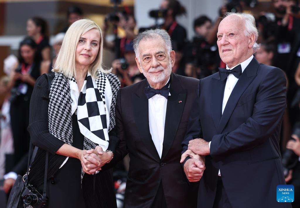 VENECIA, 28 agosto, 2025 (Xinhua) — Imagen del 27 de agosto de 2025 del director alemán, Werner Herzog (d), y el director estadounidense, Francis Ford Coppola (c), llegando a la alfombra roja de la ceremonia inaugural del 82° Festival de Cine de Venecia, en Venecia, Italia. Herzog recibió el premio León de Oro a la Trayectoria del festival de cine en la ceremonia inaugural. (Xinhua/Li Jing)