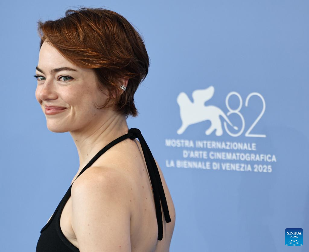 VENECIA, 28 agosto, 2025 (Xinhua) — Emma Stone, de la película «Bugonia», posa para una sesión fotográfica durante el 82° Festival de Cine de Venecia, en Venecia, Italia, el 28 de agosto de 2025. (Xinhua/Li Jing)