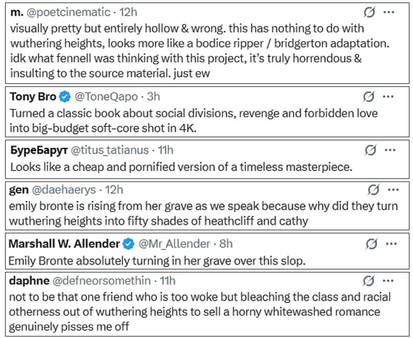 Ante la salida del tráiler, los fans expresaron su profundo rechazo en foros y redes sociales. “No es por ser ese amigo demasiado progresista, pero blanquear la otredad de clase y raza de Cumbres borrascosas para vender un romance calenturiento me indigna de verdad”, escribió un espectador.