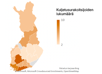 Jätelaitosten kuljetusurakoiden yksittäisten yritysten lukumäärä maakunnittain. Etelä-Karjalan, Keski-Pohjanmaan, Keski-Suomen ja Lapin maakuntien osalta tiedot osittain puutteellisia