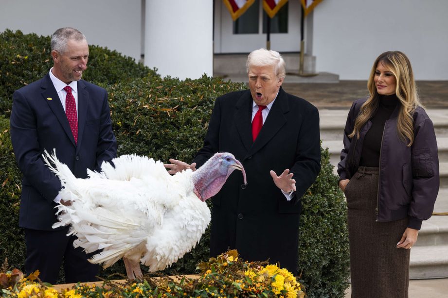 Trump (keskellä) armahti Gobble-nimisen kalkkunan Valkoisen talon ruusutarhassa Washington DC:ssä, Yhdysvalloissa, 25. marraskuuta 2025. Valkoisen talon vuosittainen perinne armahtaa kiitospäivän kalkkuna juontaa juurensa vuoteen 1989. Silloin presidentti George H.W. Bush armahti kalkkunan ruusutarhassa. JIM LO SCALZO / POOL, AOP