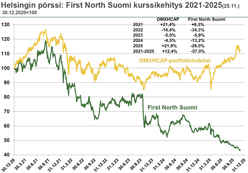 First Northin yhteenlaskettu pörssiarvo on romahtanut 57 prosenttia vajaan viiden vuoden aikana, ja vastaavasti Helsingin pörssin päälistan yhtiöiden arvo on noussut noin 12 prosenttia. Angervuon selvitys First Northista kattaa aikajakson, joka ajoittuu vuoden 2021 alun ja kuluvan vuoden 25. lokakuun väliseen aikaan.