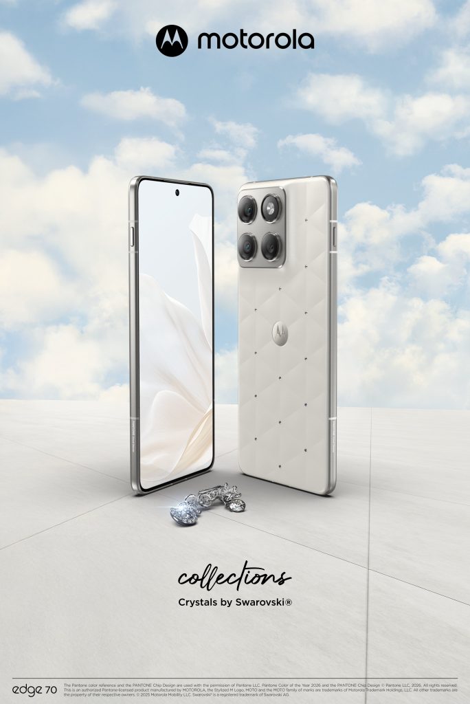 Motorola ja Swarovski jatkavat yhteistyötään uudella erikoismallilla, sillä luotettu vuotaja Evan Blass julkaisi ensimmäiset kuvat tulevasta Motorola Edge 70 Swarovski -versiosta. Laitteen erikoisväriksi on valittu Cloud Dancer, joka on nähtävästi Pantonen vuoden 2026 väri.