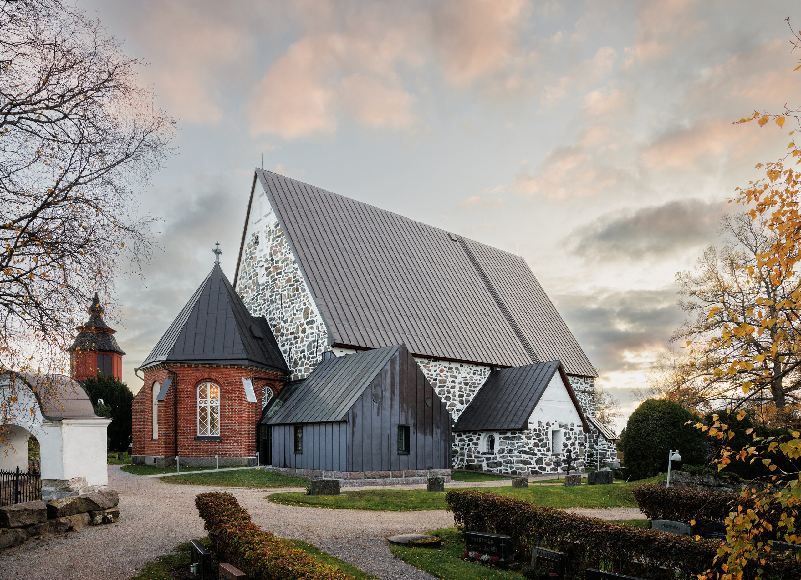 Liedon keskiaikaisen kivikirkon koilliskulmaan tehty uudisosa, Leipähuone, mukailee vieressä olevan alkuperäisen sakariston ulkohahmoa. Patinoitu kuparipellitys saa sen maastoutumaan kirkkorakennuksen ulkoarkkitehtuuriin. Kuva: Antti Partanen