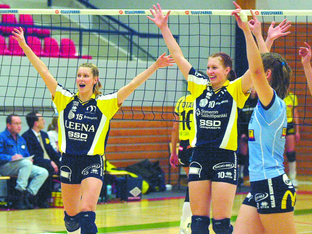 Salon Viesti pelasi vuonna 2002 vielä Urheilutalolla. Pistettä juhlivat Laura Tuominen (vas.), Terhi-Maria Aurala ja Riikka Mäki. SSS-arkisto/Kirsi-Maarit Venetpalo